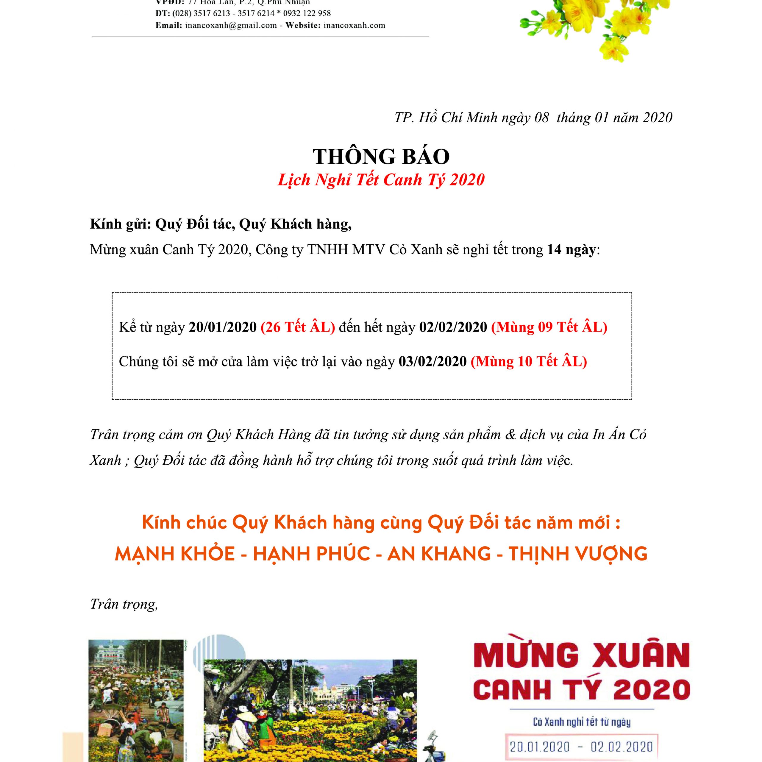 • In Cỏ Xanh bắt đầu nghỉ tết Canh Tý 2020 từ 26 Tết ÂL(08/01/2020)